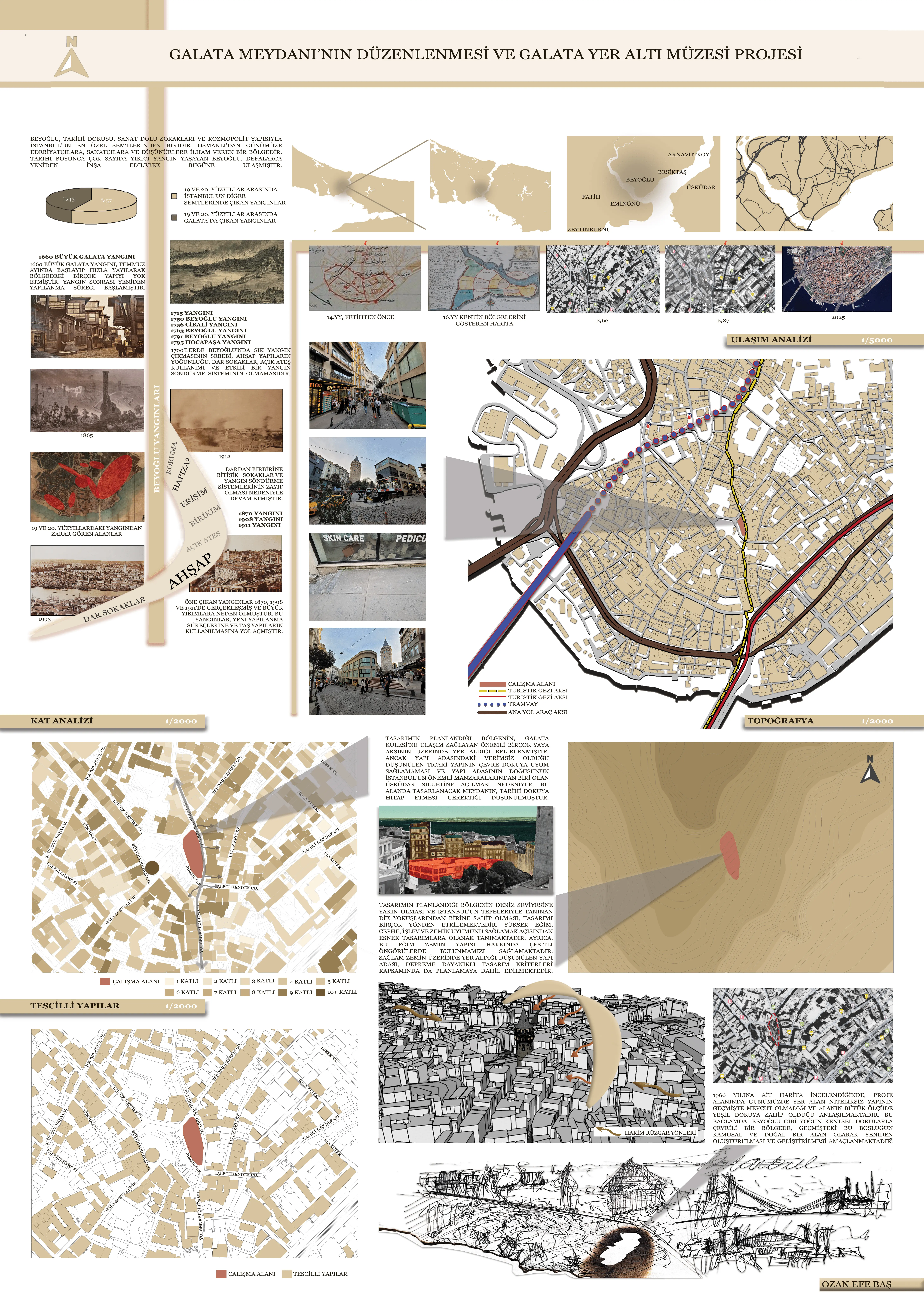 Galata Yeraltı Müzesi, tarihi dokuya zarar vermeden Galata Kulesi’nin eteklerinde konumlanan, geçmişi ve geleceği buluşturan bir mekândır. Ziyaretçiler, sur duvarlarını izleyen yeraltı sergi akışıyla kentin Bizans, Ceneviz ve Osmanlı dönemlerini deneyimler. Doğal ışık bacaları ve geçirgen mekân kurgusu sayesinde yeraltı alanları canlı ve davetkâr kalır. Sürdürülebilirlik yaklaşımıyla tasarlanan müzede yağmur suyu geri kazanımı, doğal ısı yalıtımı ve geri dönüştürülebilir malzemeler öne çıkar. Üst meydan, oturma teraslarıyla Galata Kulesi’ni çerçeveleyen kamusal bir buluşma alanına dönüşerek, kenti ve hafızasını bir araya getirir.